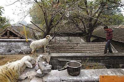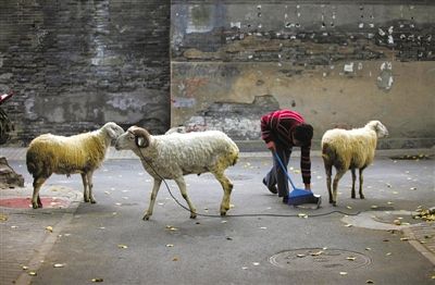 2013年11月1日,北京某胡同。王先生正在清扫羊屎,每次在胡同里遛羊时,他总是随身带着扫把和簸箕。