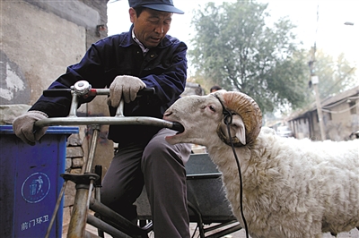 这是北京市民老王每天“遛”羊时的情形。